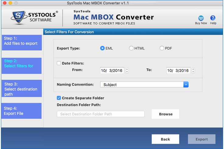 Mac MBOX Converter provides multiple options to select an appropriate naming pattern to save the email while exporting MBOX file to EML or MSG etc. The examples for file naming conventions are subject, save as, DD–MM–YY, MD5, auto incremental etc and many more.