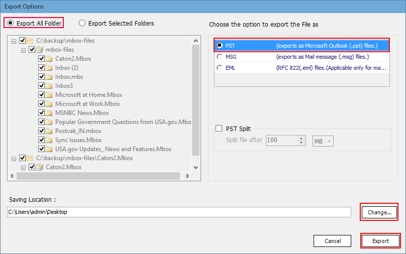 Windows & Mac MBOX file to PST converter tool provides option to spit PST file by its size before the conversion of the MBOX file data to PST file. Spit option divides PST file data by size which can be in MB or GB. User can select a desired size to export results data.